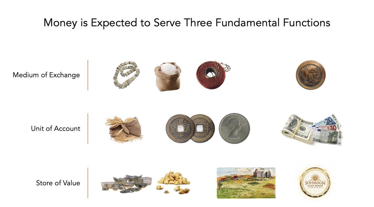要比较黄金和比特币,我们先聊聊这个品类最大的目录:金钱。金钱具有三大内核功能:交易媒介(medium of exchange)、计价单位(unit of account)和财富储值(store of value)。从贝壳、铜钱到现代法币(如美元、欧元),交易媒介和计价单位不断迭代。而黄金、白银、土地及蓝筹股则长期作为主流储值选择。