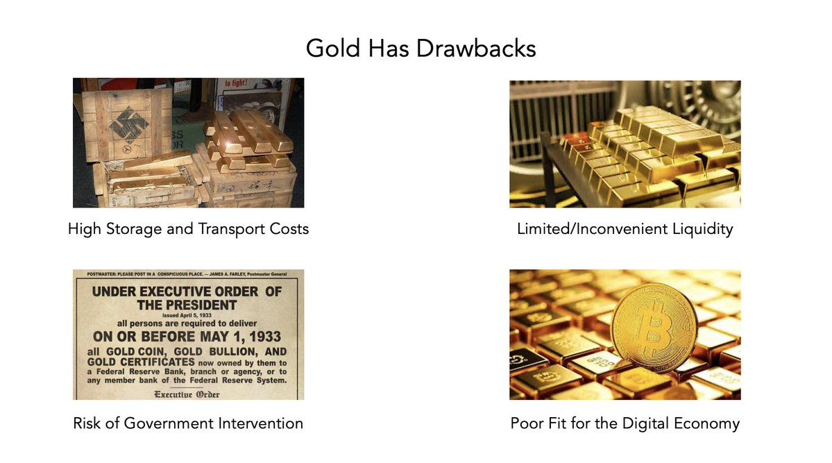 储藏黄金需要昂贵的安全金库、保险,有时甚至要承担运输成本,数量越大开销越高。二战期间,巴黎银行保险柜里的黄金就被德军直接掠夺,这件事给我最大的启示就是:the safe in the bank, is not safe at all.在极端年代,黄金变现的成本很高。二战中就出现过类似情况,无论你是在上海、巴黎,还是阿姆斯特丹,黄金交易通常面临高额折扣,往往比现货价低 30-50%,而在高风险环境下折扣更大。更糟糕的是,在冲突地区交易黄金往往伴随严重的人身风险——一旦别人知道你持有金条,被抢 劫和撕票都是随时可能的。政府还会通过没收和价格管制的方法,来进一步破坏持有黄金的可靠性。比如 1933 年,美国要求公民以低于市场的固定价格交出大部分黄金,否则将面临严厉处罚。请注意:当时美国政府要求所有公民的黄金以 每金衡盎司 20.67 美元 的固定价格交出。随后,1934 年通过《黄金储备法》(Gold Reserve Act),政府将黄金官方价格 重新估值为每金衡盎司 35 美元。这意味着让全体公民手上的黄金在短短一年内就被“贬值”了约 41%。美国当时共征收了超过 2600 吨黄金,这直接改变了货币政策,也为后来在 1971 年彻底终结金本位埋下伏笔。这一切,都发生在全世界可能最尊重私有产权制度的灯塔国,20世纪的美国。除此之外,在今天的数字经济中,黄金不够“数字化”的局限也很明显。比如,你没有办法通过任何一个电子钱包给你的朋友,或者你的另外一个地址发送一公斤的黄金。2009年,比特币出现了!它到底是什么?