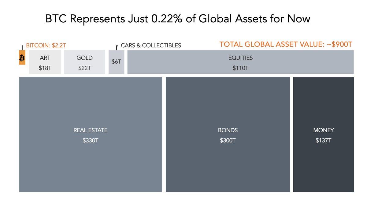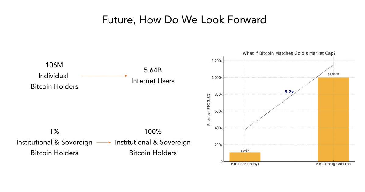 如果未来,比特币持有者从 1 亿增加到 56 亿(相当于今天的互联网用户数量),并且得到全球机构与主 权政府的广泛采用,那比特币的价格会到多少?这也是为什么很多人会去尝试预测比特币未来很快会到100万美元的原因,因为100万美元基本会让比特币的市值追平今天的黄金的市值。