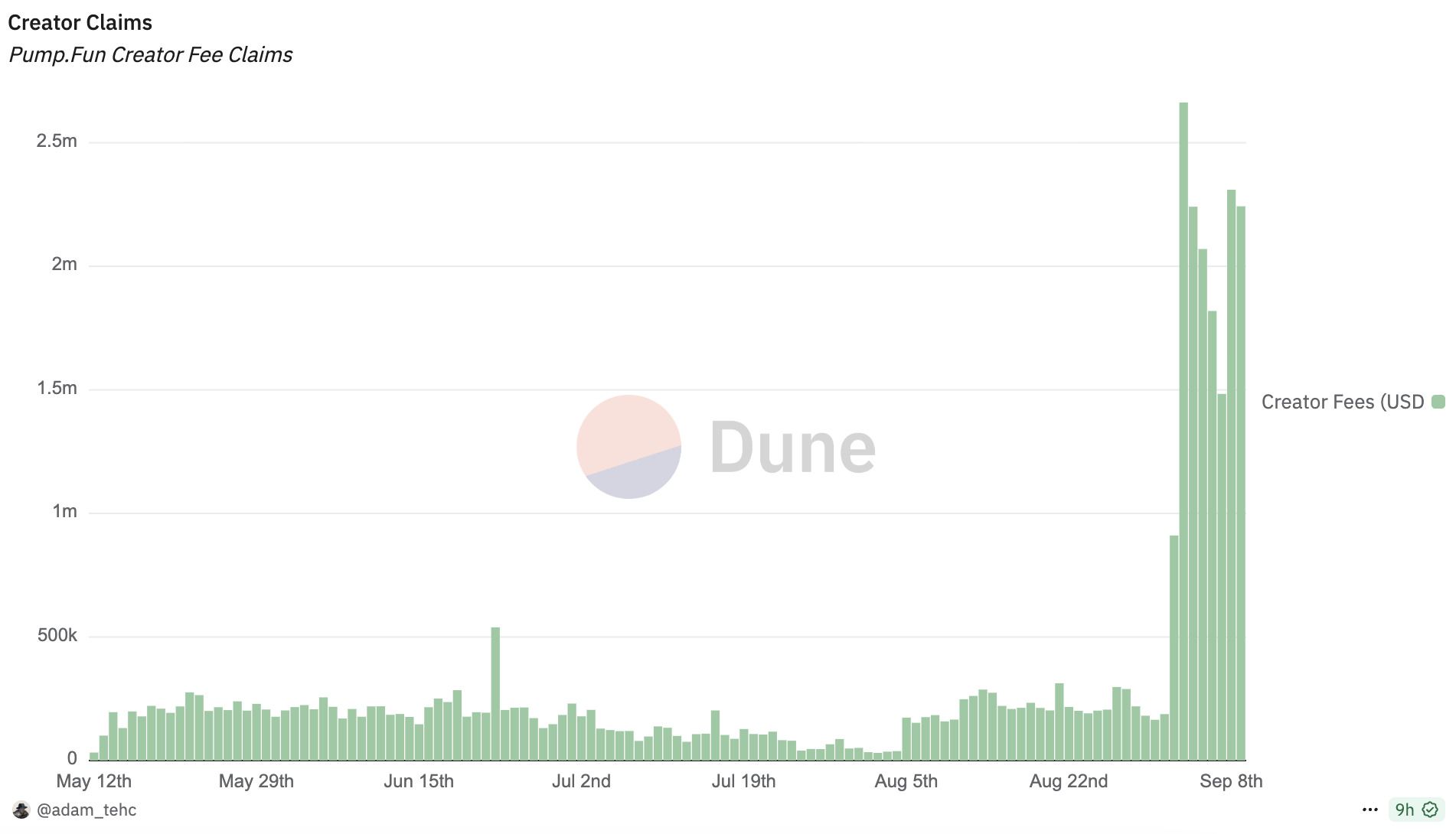 9月初,Pump.fun瞄准CCM(创作者资本市场)赛道,推出Project Ascend更新计划,引入动态费用V1更新,创作者费用将按照市值进行分级。此费用结构适用于所有PumpSwap代币(无论新旧),Pump.fun协议费率和向流动性提供者(包括被销毁的 LP)自动复合的费用与以前完全相同。Dune数据显示,过去7天,Pump.fun创作者收入超过1626.6万美元,远超协议收入;同时,领取收益的独立钱包地址也从8月初的1898个回升至9065个。
