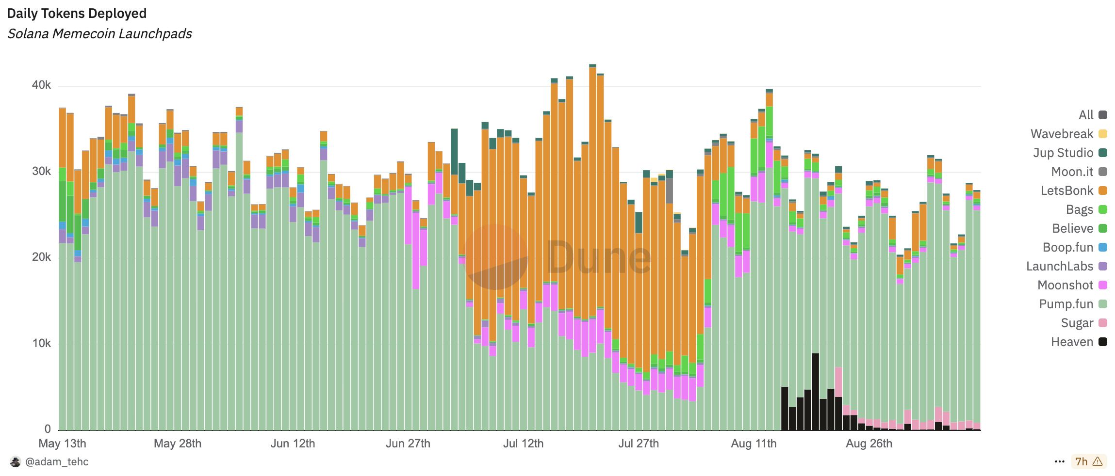 Dune数据显示,截至9月10日,BONK.fun的内核指标均出现大幅回落,每日代币部署占比从高点74.5%跌至2.7%,每日代币毕业数量占比由88.8%降至1.2%,交易量占比则从86.4%下滑至3.2%。显然,现阶段BONK.fun已失去市场优势。