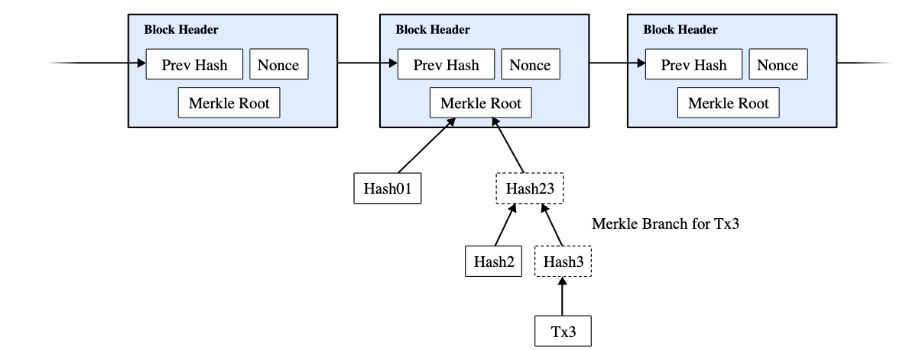 在中本聪的比特币白皮书中勾勒出的SPV(简化支付验证)示意模型。