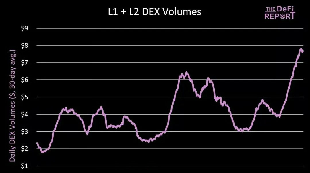 平均每日DEX 交易量较4 月低点上涨了266%,其中L1 (第一层) 主网贡献了约67% 的交易量。