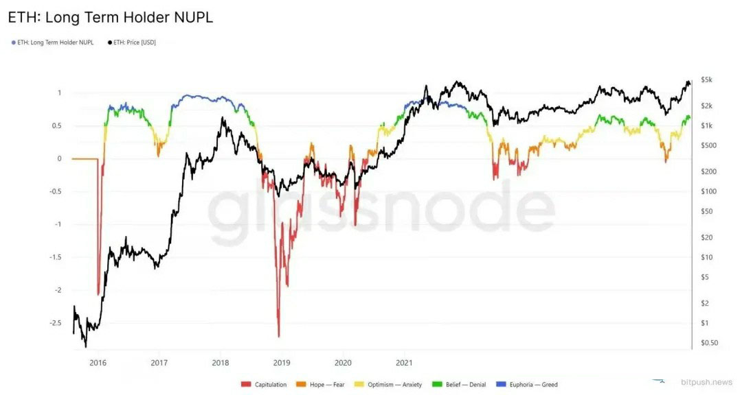 就长期持有者的未实现净损益而言,ETH 尚未达到我们在过去周期中见过的极端水平(蓝色区域)。