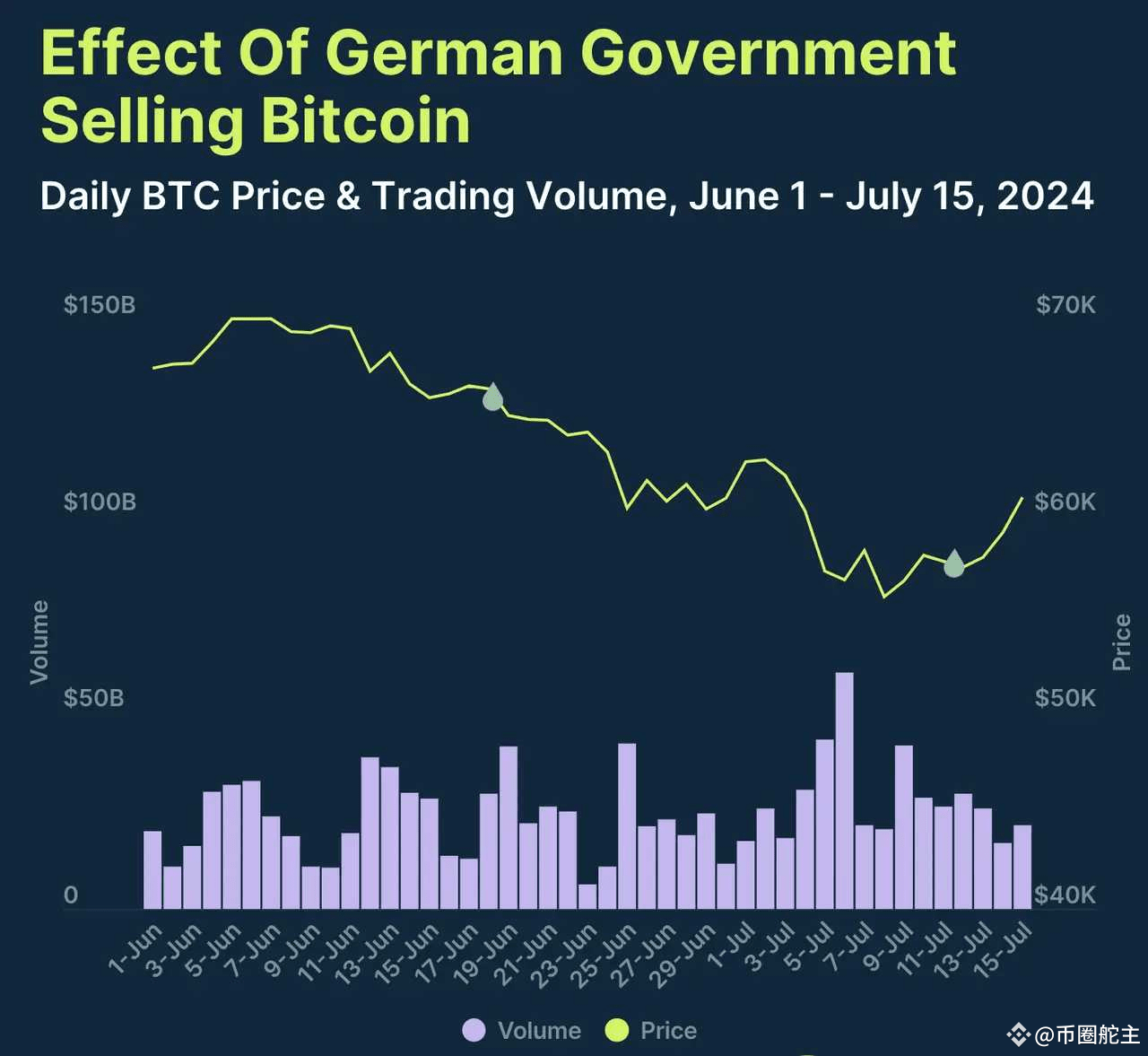 持有大量加密货币的政府可以通过其行动显著影响市场价格。最近的一个例子是德国政府在 2024 年 6 月 19 日至 7 月 12 日期间清算了其所有比特币持有量(46,359 BTC)。这引发了抛售,导致比特币下跌 15.7%,从 64,547.32 美元跌至 54,418.46 美元。