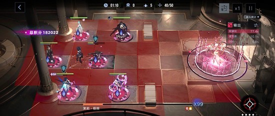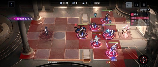 等到茉莉回家放十字伤害的时候,把角色挪到场地左侧蓝色格子处(看图),打完之后挪到场地右侧红色格子处(看图),注意把阿黛拉放在最前面,这个时候可以把剩下的背水挂上了。
