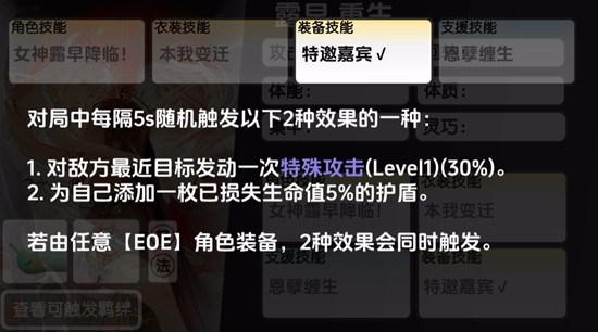 露早的装备技能特邀嘉宾在对局中每5秒随机触发两种效果之一:一是对最近敌方目标发动一次特殊攻击,二是为自己施加一个等于已损失生命值5%的护盾。若由任意EOE角色装备,则两项效果将同时触发,大幅提升生存与输出频率。这一技能进一步强化了露早在混编队伍中的适应性,尤其在配合特定角色时能发挥更大作用。