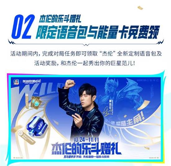 活动内容:完成对局任务即可领取“杰伦”全新定制语音包及活动奖励,和杰伦一起秀出你的巨星范儿!