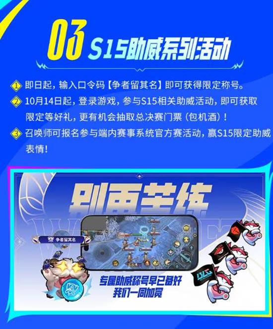 活动内容:输入口令码【争者留其名】即可获得限定称号。登录游戏,参与S15相关助威活动,获取限定等好礼,更有机会抽取总决赛门票(包机酒)!召唤师可报名参与端内赛事系统官方赛活动,赢S15限定助威表情!