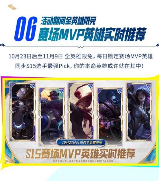 活动内容:全英雄限免,每日锁定赛场MVP英雄,同步S15选手最强Pick,你的本命英雄或许就在其中!