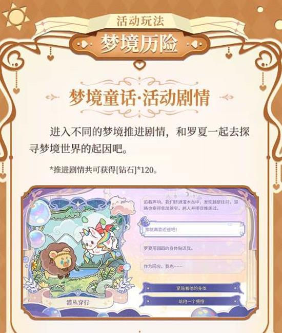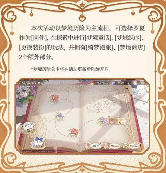 本次活动以梦境历险为主流程,可选择罗夏作为[同伴],在历险中进行[梦境童话]、[梦域织序]、[当前装扮]的玩法,并拥有[绮梦漫旅]、[梦境商店]2个额外部分。