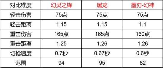 幻灵之锋与屠龙、墨刃-幻神对比,幻灵之锋在轻击距离、轻击角度、重击伤害上表现出色,尤其轻击角度远超墨刃-幻神;屠龙在重击距离、角度上略占优,墨刃-幻神切枪速度最快。