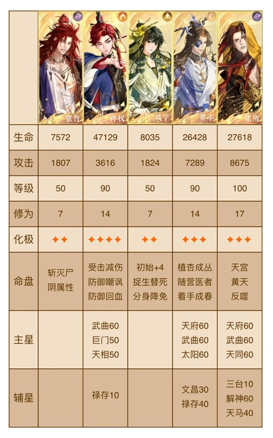 张角、孙权进场生命最高,高星董奉可能需要鞭,张角可带生命星石,推荐拉满100+17