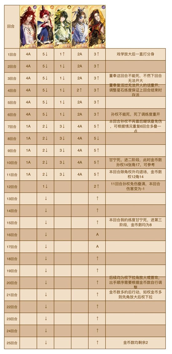 注意点:此时孙权每回合挨打次数减少,后面免伤可能叠不起来,所以可以根据练度调整操作,第7回合及之后继续重复前6回合的操作让孙权多挨打叠免伤,觉得差不多稳妥之后再从表格第7回合开始操作。
