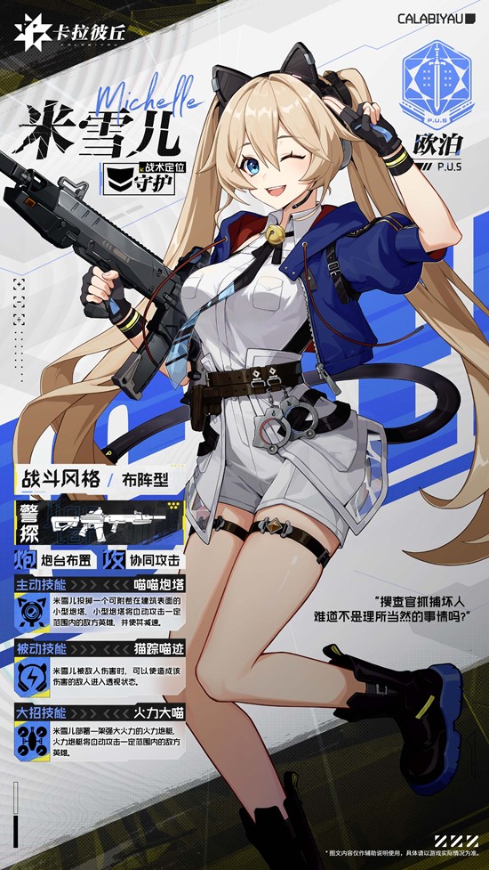 米雪儿是许多玩家在卡拉比丘中优先考虑的首充选择之一。她的主动技能喵喵卫士可在当前位置部署自动攻击的机械装置,对进入范围的敌人造成伤害并附加减速效果。被动技能猫踪喵迹在她被敌方武器命中后短暂触发透视能力,有助于反制偷袭。终结技能火力大喵能够召唤一架空中炮艇,持续对区域内敌人进行自动扫射,提供稳定的远程火力支援,在防守或推进阶段都具备较高战略价值。