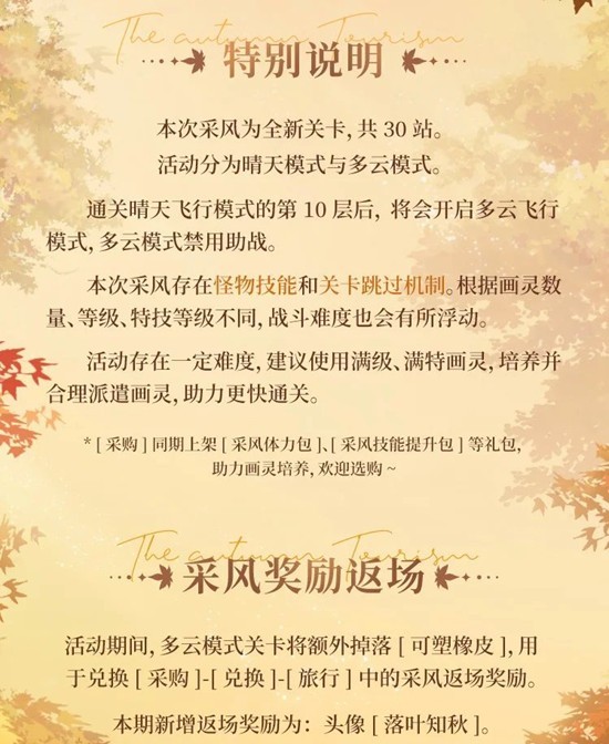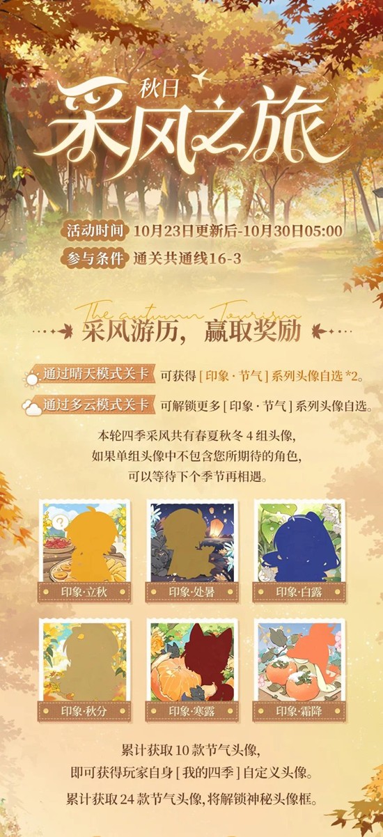 10月23日更新后-10月30日05:00,全新「秋日采风之旅」正式开启,参与活动可得[印象·节气]系列头像奖励。