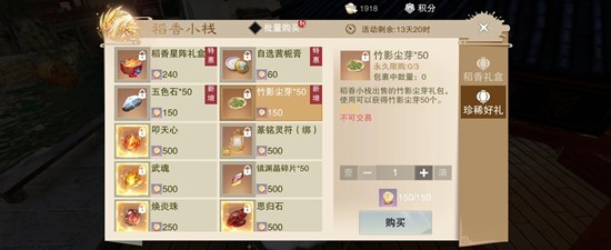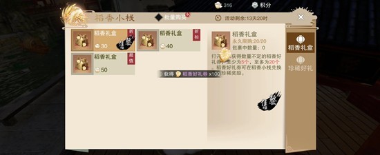 微氪玩家可以重点关注折扣礼盒,用来兑换茶叶性价比很高。推荐购买30个礼盒组合:20个30元宝的基础折扣款+10个40元宝的进阶款。