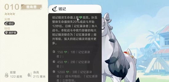 墨角兽的羁绊系统围绕“铭记元理”展开,属于当前版本中较易成型的流派之一。当队伍中存在多个铭记属性的精灵时,可激活召唤效果,生成名为“记忆篆录者”的召唤物。随着铭记精灵数量增加,羁绊等级提升,召唤物的强度也会随之增长。在一阶状态下,记忆篆录者可提供150%的增益效果;二阶达到450%;最高三阶时甚至能带来1200%的敌人削弱效果。该召唤物在战斗初始即登场,三阶满配情况下表现尤为强势。