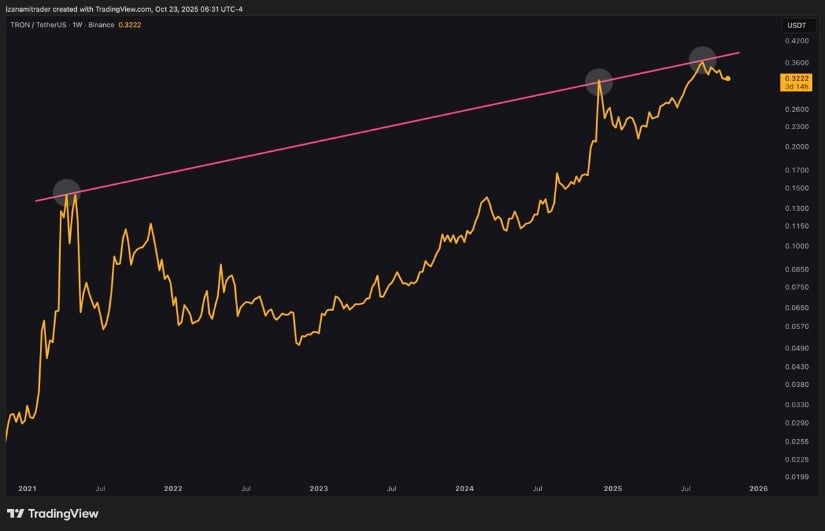 TRON近期再次测试了自2021年起持续充当主要阻力的多年度上升趋势线。此前每次触碰该趋势线均引发回调,而本次在0.33至0.34美元区间的重新测试可能再度成为关键转折点。价格走势显示该上边界附近动能减弱,暗示短期买家可能力竭。