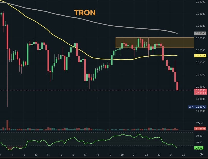 TRON跌破0.32美元关键需求区后显露短期疲态。来源:enri_dev via X