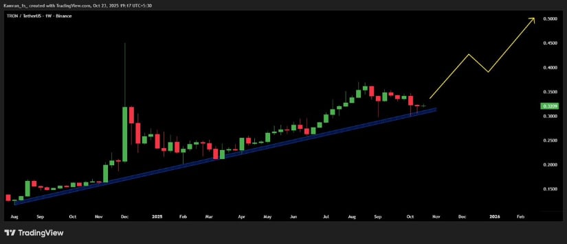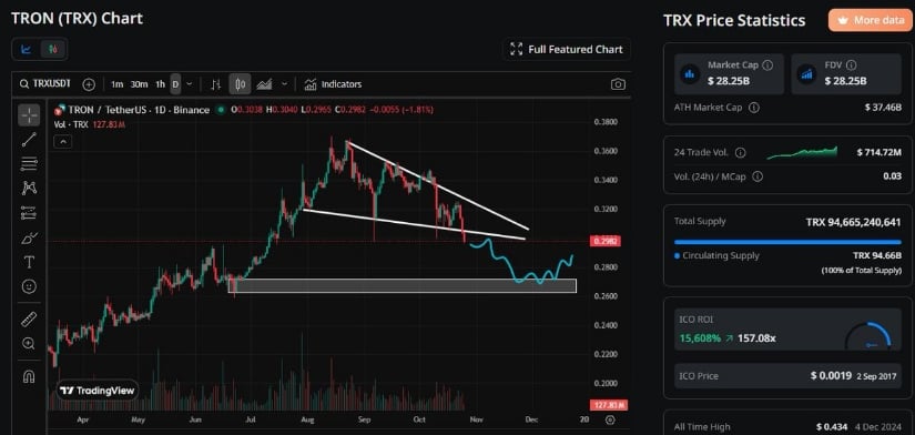 技术面来看,TRX正从下降楔形形态中反弹——该形态通常出现在局部下跌趋势衰竭点附近。若动能持续维持在0.31美元上方,结构可能再次转为看涨。结合链上资金流入与网络活动增长,TRON基本面似乎正迎来最佳强化时机。