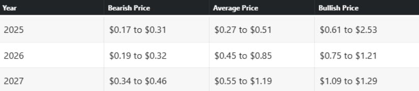 Tai Smile的分析指出,在持续采用和国库扩张支持下,TRON可能在2025-2027年进入稳定增长期。其预测模型显示:2025年TRX交易区间0.17-0.89美元,2026年0.32-1.21美元,若市场条件配合,2027年有望突破1美元关口。