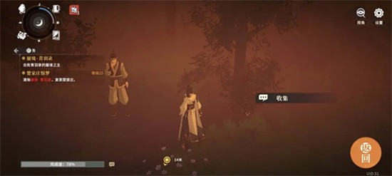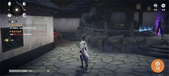 楚家庄是本章节的重点区域之一,包含多个独立谜题和支线任务。第一个谜题线索藏在树后,玩家需绕到特定树木的背面才能发现隐藏信息。该位置容易被忽略,建议对场景中的每棵树都进行排查。