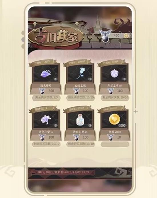 通关任意路线的第五关后,可兑换静态称号奖励。除此之外,【古旧藏室】还有**【凝光碎片、心绪之花、升星之章、进化之华、告白心愿、金币】**等多重奖励可供兑换。