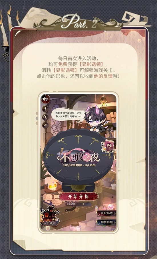 每日首次进入活动,均可免费获得【显影透镜】、解锁游戏关卡。活动期间最多可获得20个【显影透镜】。