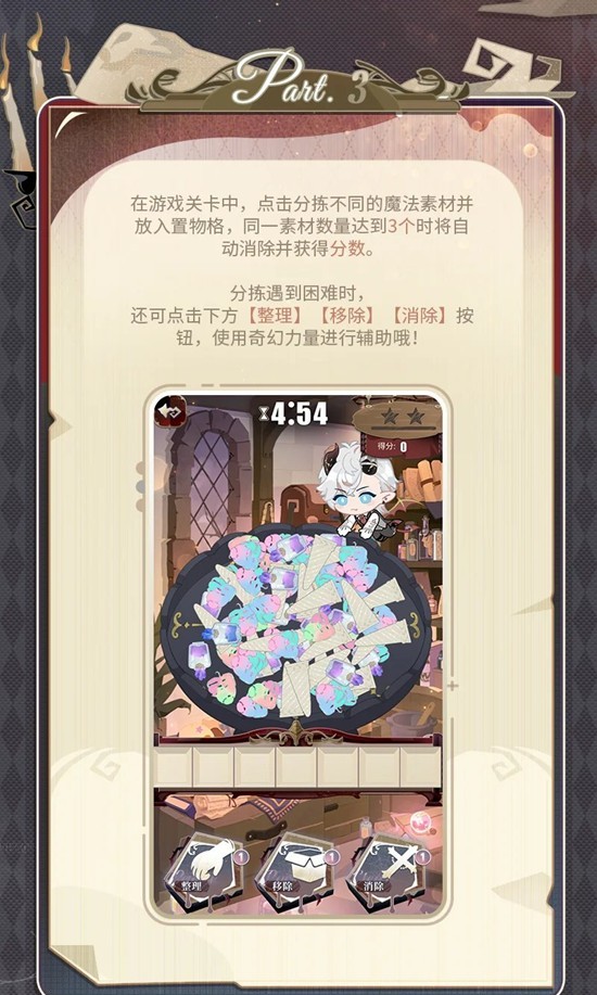 在游戏关卡中,点击分拣不同的魔法素材并放入置物格,同一素材数量达到3个时将自动消除并获得分数。分拣达指定分数,即可通关。任意关卡首次通关和完美通关时,均可获得【水银墨瓶】奖励。