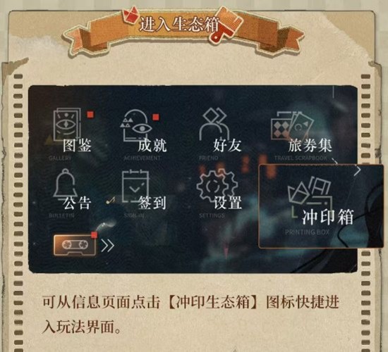 玩家可以在设置-游戏页调整待机时间,然后在主界面与其他部分界面不进行任何操作,满足待机时间要求后,直接进入待机模式,该模式下可进入冲印生态箱。