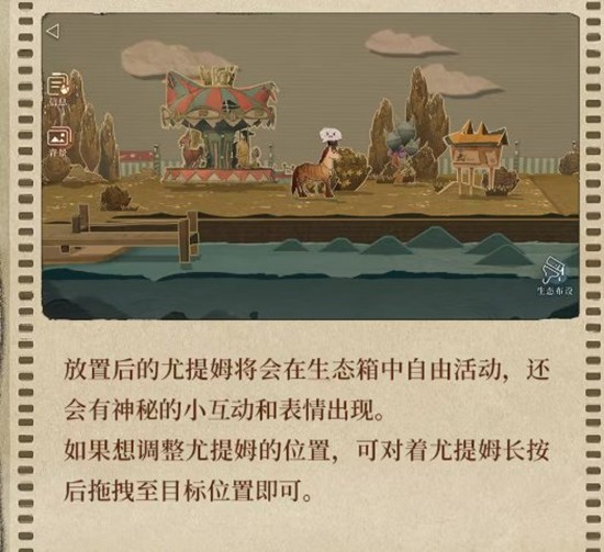 放置后的尤提姆将会在生态箱中自由活动,还会有神秘的小互动和表情出现。如果想调整尤提姆的位置,可对着尤提姆长按后拖拽至目标位置即可。