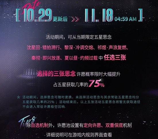 1.活动期间,猎人可从限定五星思念「沈星回·错拍溯行」、「黎深·冷调交熔」、「祁煜·声浪复燃」、「秦彻·即兴放逐」、「夏以昼·灼频过载」中任选3张,所选思念许愿概率限时大幅提升,占五星获取几率的75%。