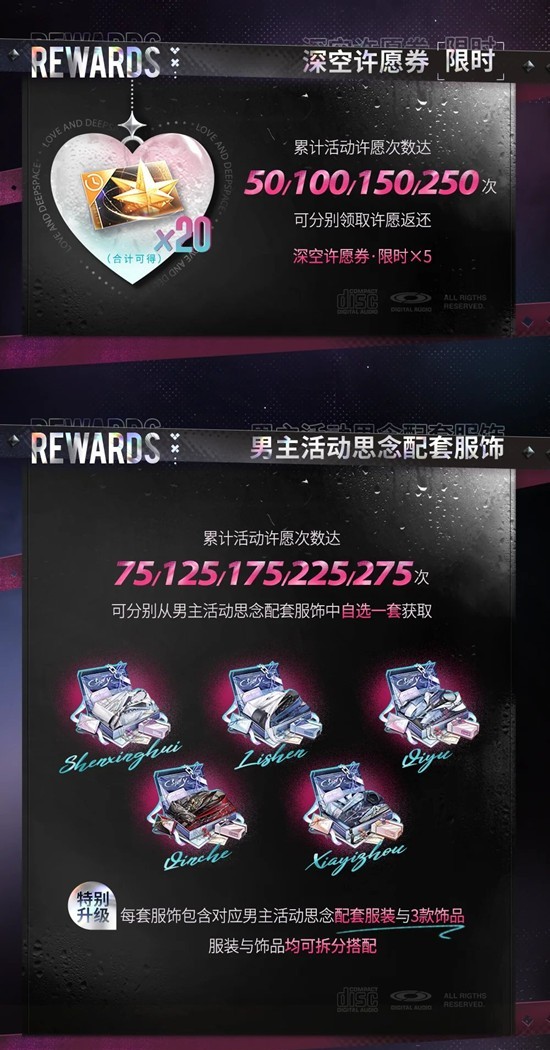 累计活动许愿达75、125、175、225、275次时,可分别从当期男主「活动思念配套服饰」中自选一套获取;