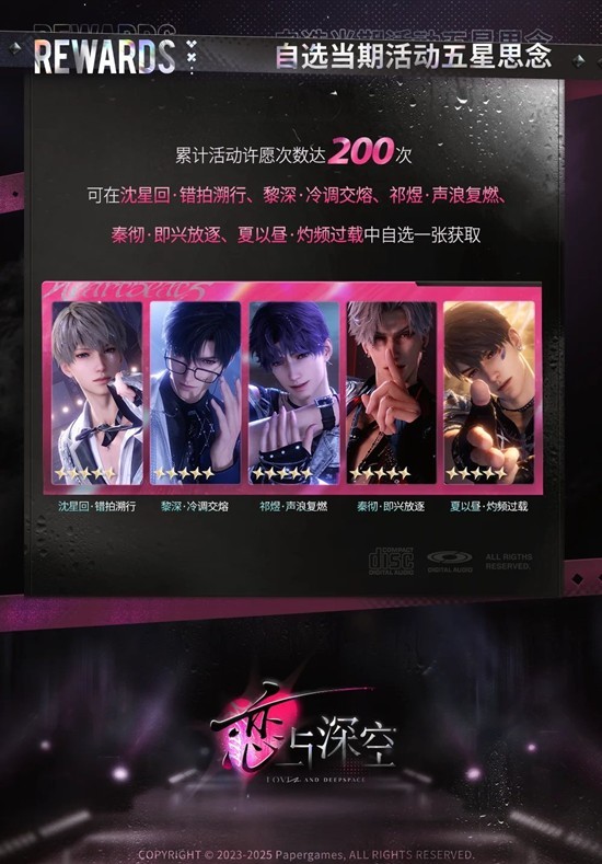累计活动许愿达200次时,可在「沈星回·错拍溯行」、「黎深·冷调交熔」、「祁煜·声浪复燃」、「秦彻·即兴放逐」、「夏以昼·灼频过载」中自选一张获取。