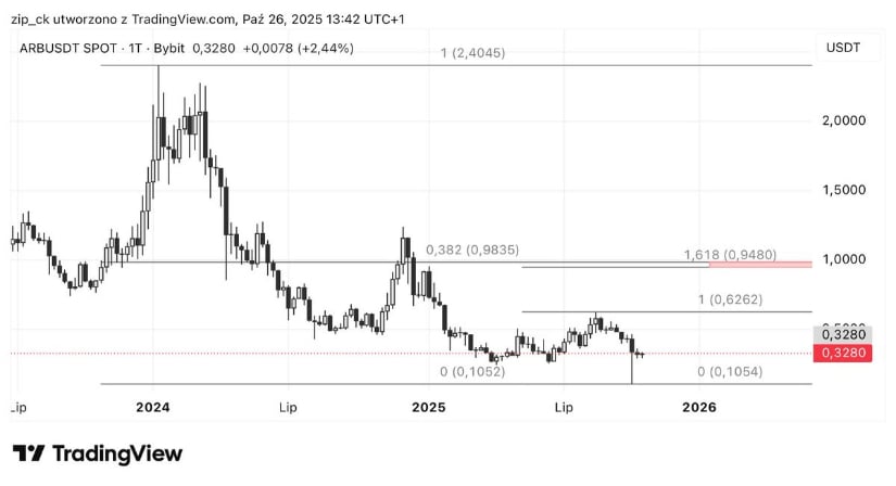 只要0.30美元附近的底部结构保持完整,ARB有望在未来数月逐步上探该压力带。突破0.40美元将确认中期趋势反转,而守住0.32美元上方则维持看涨结构。1.0和1.618斐波那契扩展位显示,完整复苏浪或将推动价格最终测试0.95-1.05美元区间。
