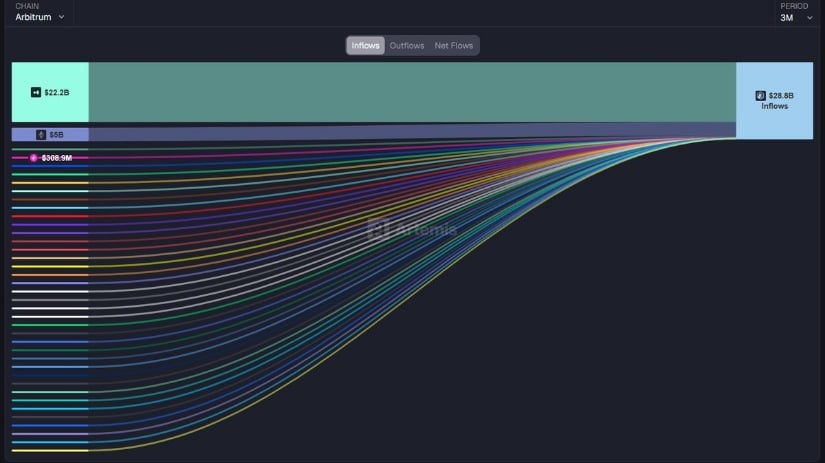 Arbitrum录得超288亿美元资金流入,预示机构信心回暖及生态强势积累。数据来源:Rand via X