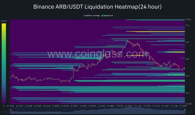 热力图同时显示下方流动性显著稀薄,短期深跌风险有限。随着交易者持续平仓空头头寸,反弹概率居高,尤其在ARB于更高时间框架收于0.34美元上方时。