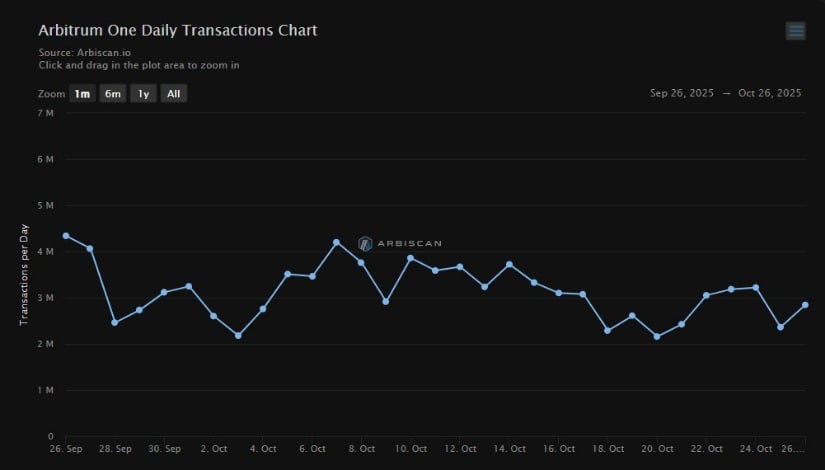 Shaurix数据显示,Arbitrum日交易量维持在210-430万笔区间,证实网络使用率持续高企。该吞吐量水平使其稳居最活跃Layer2网络之列,部分使用指标甚至比肩以太坊主网。高企的交易量带动链上费用和验证者收入同步增长,为当前价格走势奠定坚实基本面。