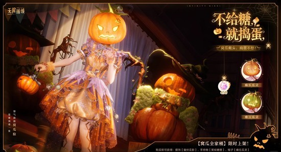 ● 花费450钻石即可获得:摆饰【蛰伏瓜影】,手持物【笑纹糖匣】、帽子【癫乐瓜灵】、【瘪泣瓜灵】、【怒焰瓜灵】!