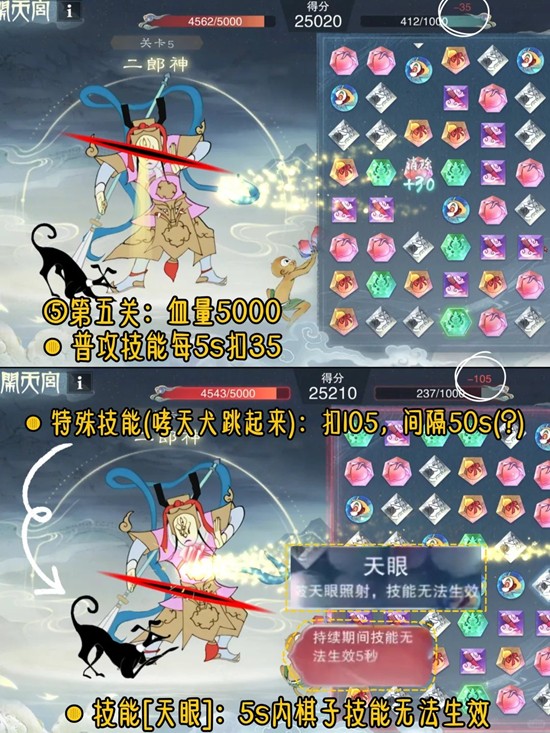 ⑤二郎神:血量5000,普攻技能每5s扣35,特殊技能(哮天犬跳起来):扣105,间隔50s(?),技能[天眼]:5s内棋子技能无法生效