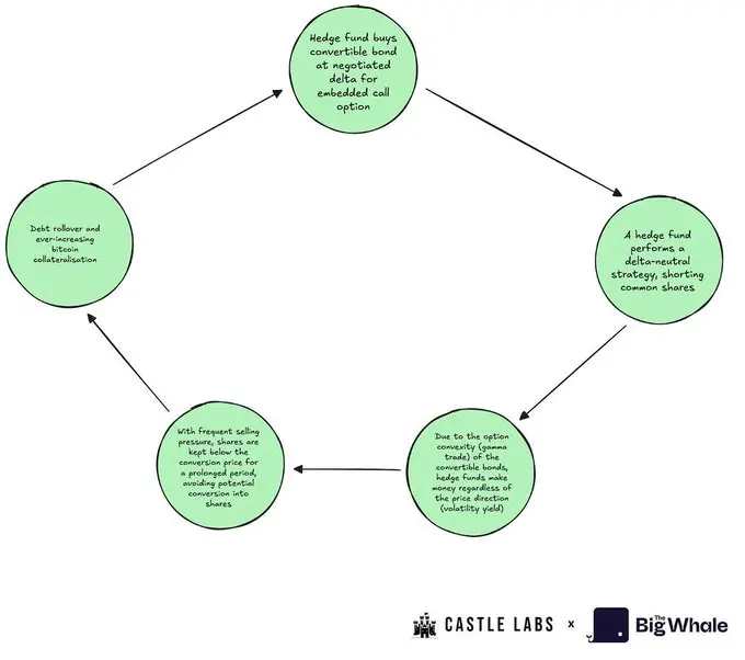 为了避免持续稀释,MSTR 与其他公司选择通过发行可转换债券进行融资。可转债通常由对冲基金购买,这些基金采用「Delta 中性策略」,因为可转债中嵌入了 OTM(价外)期权。基金会建立空头头寸,形成持续的卖压。