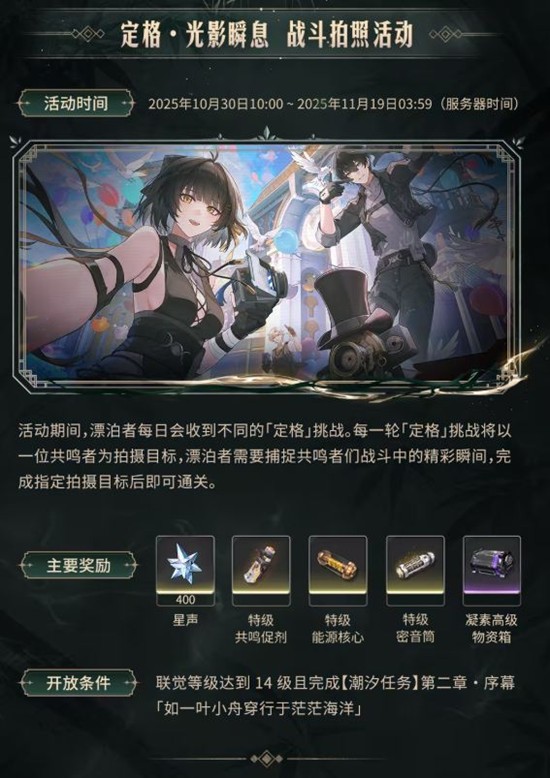 活动期间,漂泊者每日会收到不同的「定格」挑战。每一轮「定格」挑战将以一位共鸣者为拍摄目标,漂泊者需要捕捉共鸣者们战斗中的精彩瞬间,完成指定拍摄目标后即可通关。