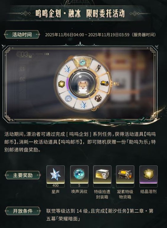 活动期间,漂泊者可通过完成[呜呜企划]系列任务,获得活动道具[呜呜邮币]。消耗一枚活动道具[呜呜邮币],即可随机获赠一份[助呜为乐]特别邮递转盘奖励。