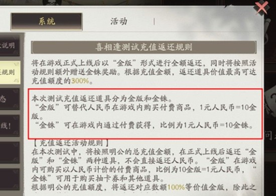 充值1元可获得10个金版和10个金铢。金版在正式服中可当作人民币使用,能购买月卡、礼包等标价人民币的商品,相当于全额返还充值本金。金铢主要用于购买抽卡券或游戏道具,帮助玩家囤积抽卡资源。
