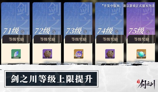 更新后游戏内剑之川的等级上限将由60级开放至75级,对应的等级奖励也会同步更新!新版本相关内容与活动可持续体验时长约6周,欢迎各位继续探索剑之川!