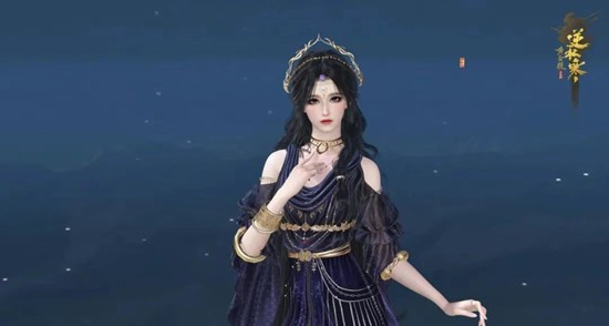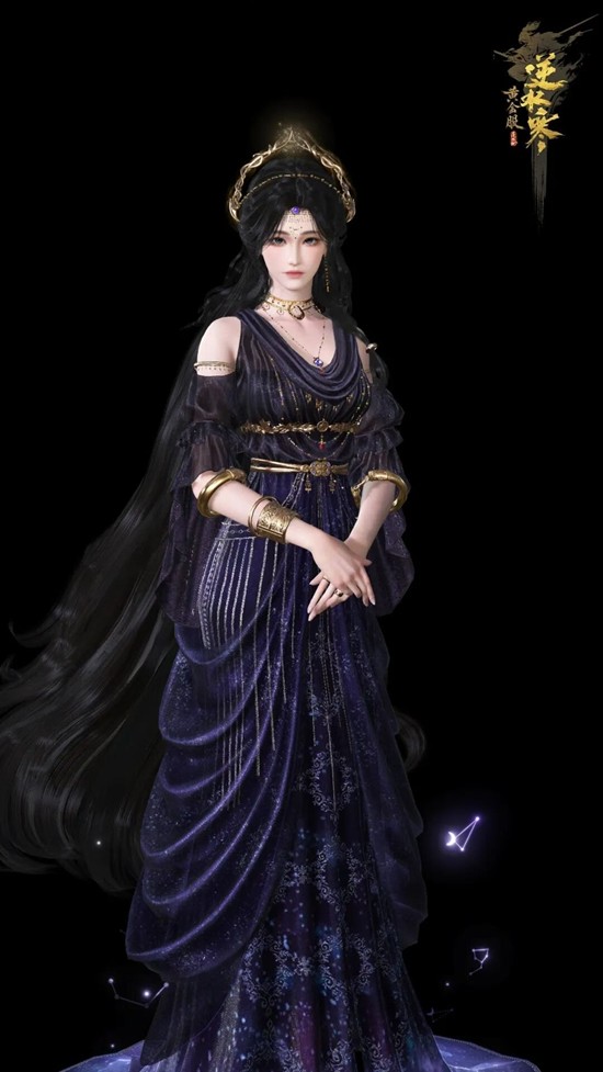 绛夜裁裙缠鎏星,风拂衣袂落月明。女款时装【鎏星绛夜】以深邃的暗紫色为主色调,搭配金色星月配饰,如同夜幕下的熠熠星河,完美契合黑夜女神的神秘华贵。