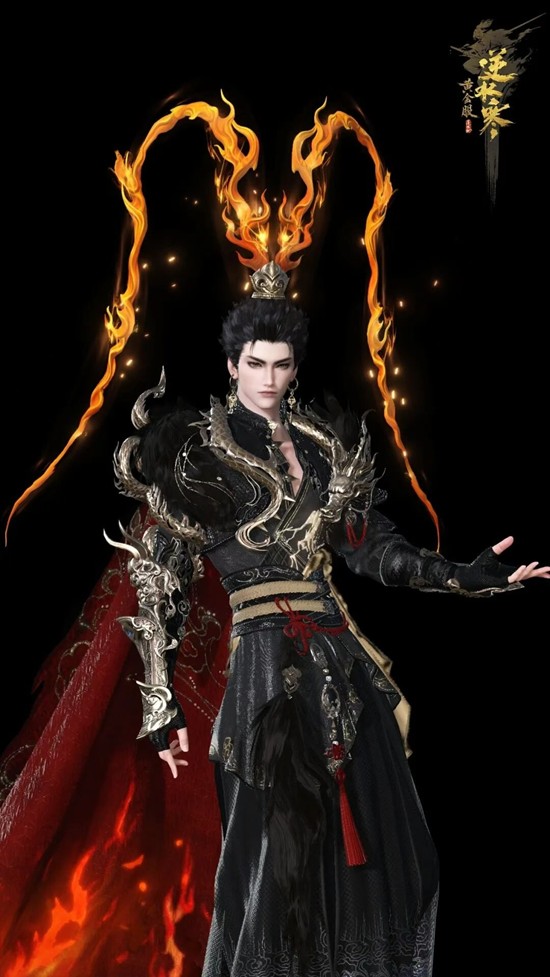 怒心翻卷裹嚣焰,沥尽焦尘意灼天。男款时装【嚣焰齐天】胸前巨龙盘踞,不怒自威。身后的绛红披风燃着熊熊烈火,举手投足间尽是睥睨天下的慑人威严。