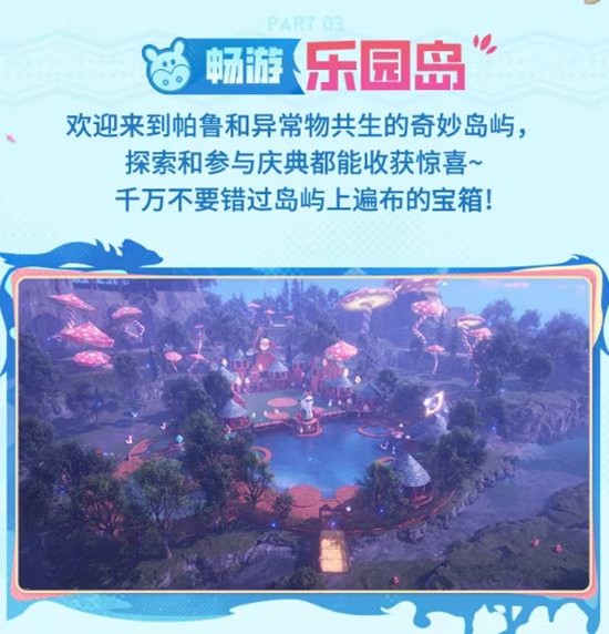 欢迎来到帕鲁和异常物共生的奇妙岛屿,探索和参与庆典都能收获惊喜~千万不要错过岛屿上遍布的宝箱!
