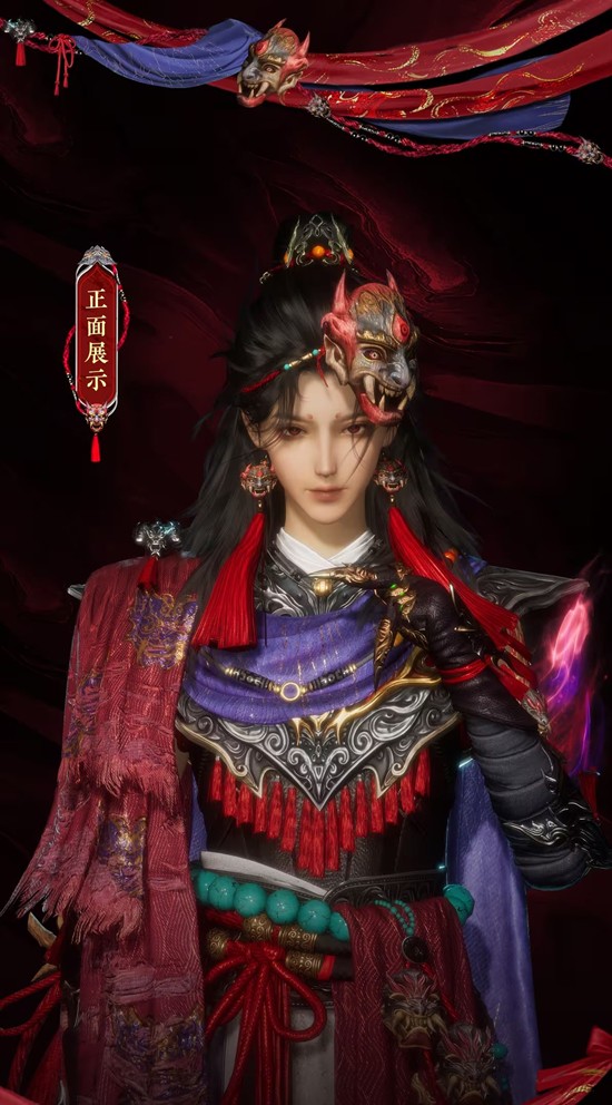 我们可以看见,外观正面展示了精致的面具和华丽的服饰。面具上的獠牙和神秘图案,以及服饰上的精细刺绣和装饰,都透露出一种古老而神秘的气息。